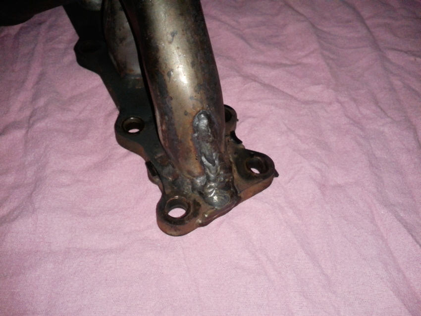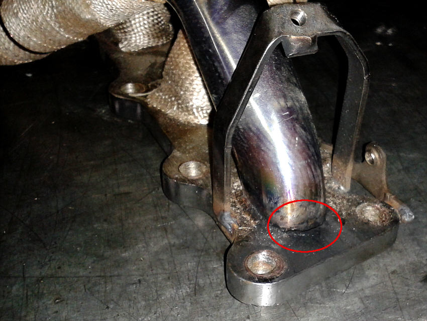 Nach dem ich den Krümmer mal wieder ausgebaut habe, sah ich, dass der Krümmer jetzt am T-Verbindungsstück gerissen war. Die Verstärkungen haben sehr gut gehalten, aber der nächste Schwachpunkt war dann wohl das T-Stück.
