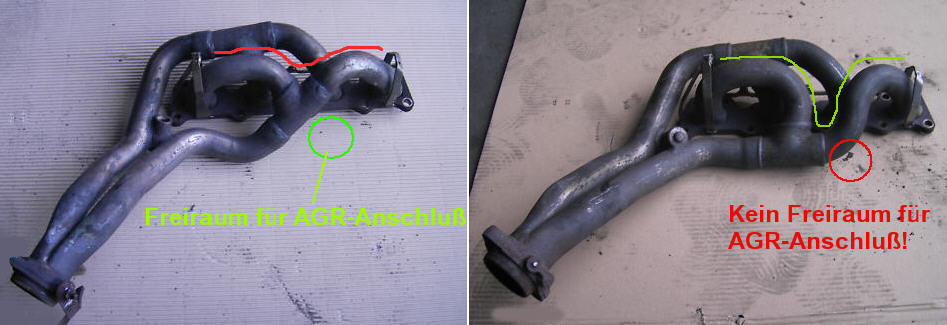 Meiner Meinung nach ist der Krümmer auch falsch bzw. ungünstig aufgebaut. in der nachfolgenden Abbildung sieht man auf der rechten Seite den alten Krümmer für die Motoren die noch keine AGR (AbGasRückührung) hatten, bei diesem kann die Längenausdehnung noch gut über die Verformung der Rohre abgefangen werden (grüne Linie). Bei der neueren Ausführung musste die Rohrführung für den AGR-Anschluss geändert werden, dadurch stoßen die beiden äußeren Abgasrohre fast grade aufeinander (rote Linie). Somit ist eine Verformung kaum noch möglich. Immerhin dehnen sich die Rohre nach ungefährer Berechnung fast 5 mm (!!!) in der Länge aus und das muss ohne Rissbildung abgefangen werden können!